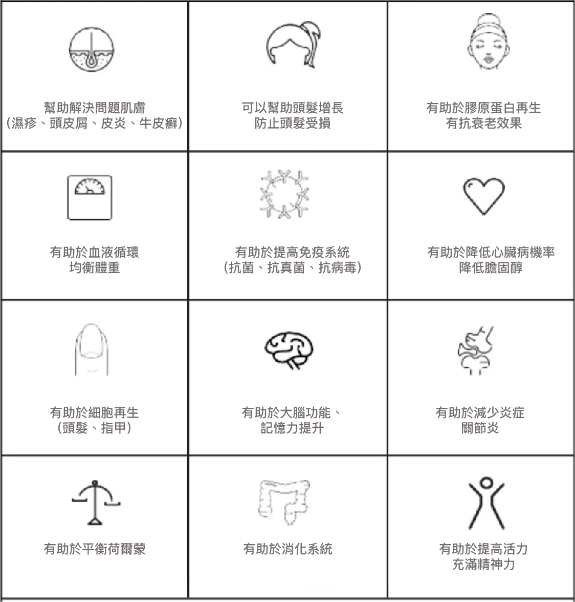 3⃣️助力腸胃工作,保持頭髮健康、光亮,改善皮膚問題等等